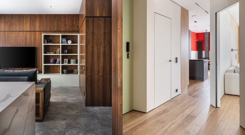 - Общий стиль интерьера. Сканди и контемпорари приветствуют светлые, почти белые или натуральные породы дерева. Классика и неоклассика тяготеют к благородным коричневым и ореховым тонам либо к светлым покрытиям под мрамор. Для лофта и минимализма характерны холодные серые, угольные или бетонные поверхности. Выбирая цвет, подумайте, впишется ли он в общую концепцию.