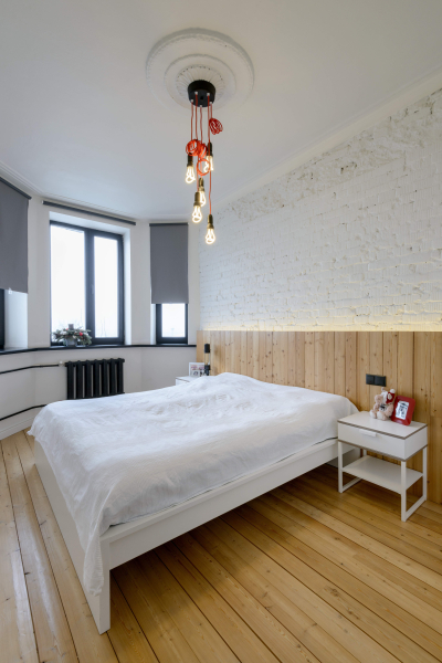 Отказаться от максимального числа перегородок. В лофтах даже ванну или душевую кабину дизайнеры нередко размещают прямо в спальне, отделяя только туалет, а стену между кухней-гостиной и приватной частью квартиры возводят не до потолка, чтобы сохранить ощущение открытости и свободы. Зонировать пространство можно за счёт освещения, цветовых акцентов, разных напольных покрытий, расстановки мебели.